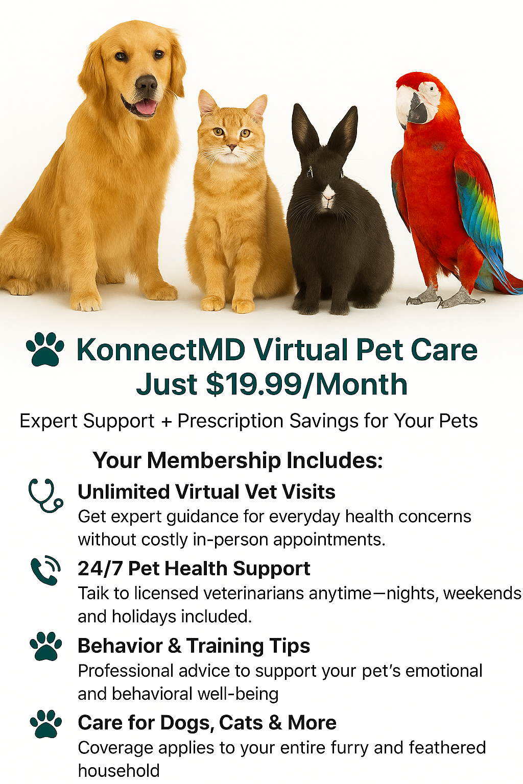 Give your pets the care they deserve—anytime, anywhere. With KonnectMD’s Virtual Pet Care, you get unlimited access to licensed veterinary professionals plus exclusive discounts on medications through MyRxValetForPets.com.